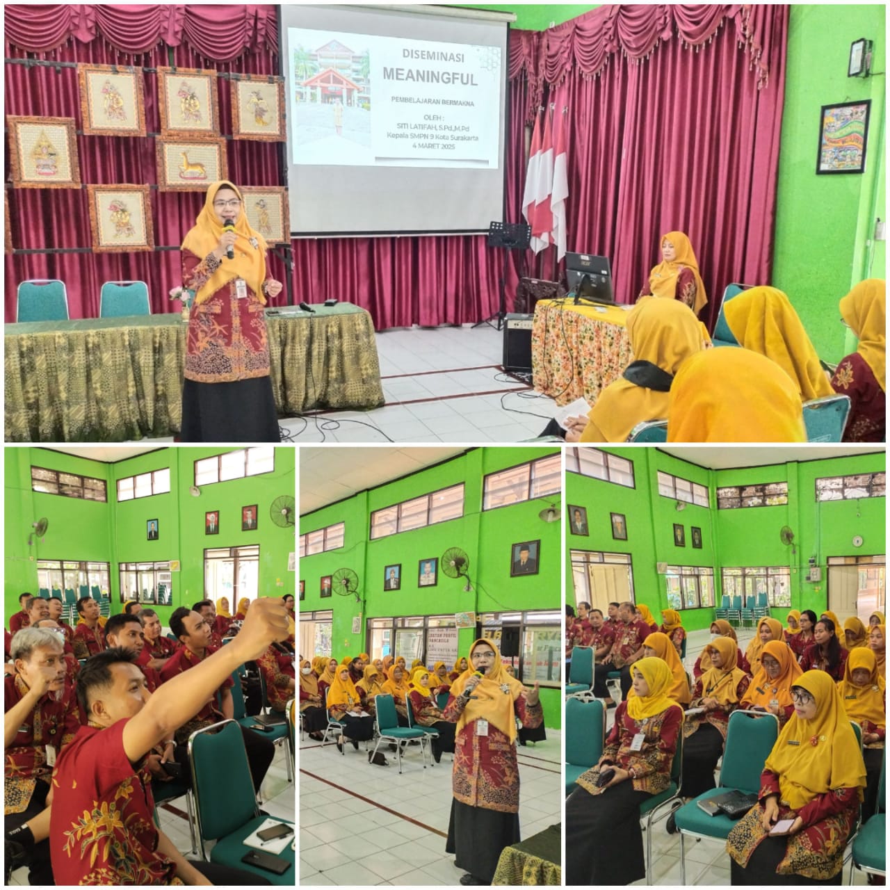 Bulan Ramadan sebagai bulan yang penuh keberkahan untuk meningkatkan keimanan dan ketakwaan terhadap sang pencipta. Semarak bulan Ramadan disambut suka cita seluruh civitas akademisi SMP Negeri 9 Kota Surakarta. Pada hari Selasa dan Rabu, 4 dan 5 Maret 2025 seluruh guru dan tenaga kependidikan (GTK) mengikuti kegiatan diseminasi meaningful (pembelajaran bermakna) dengan pemateri Ibu Siti Latifah, S.Pd., M.Pd. (Bu Ifah) di aula SMP Negeri 9 Kota Surakarta.