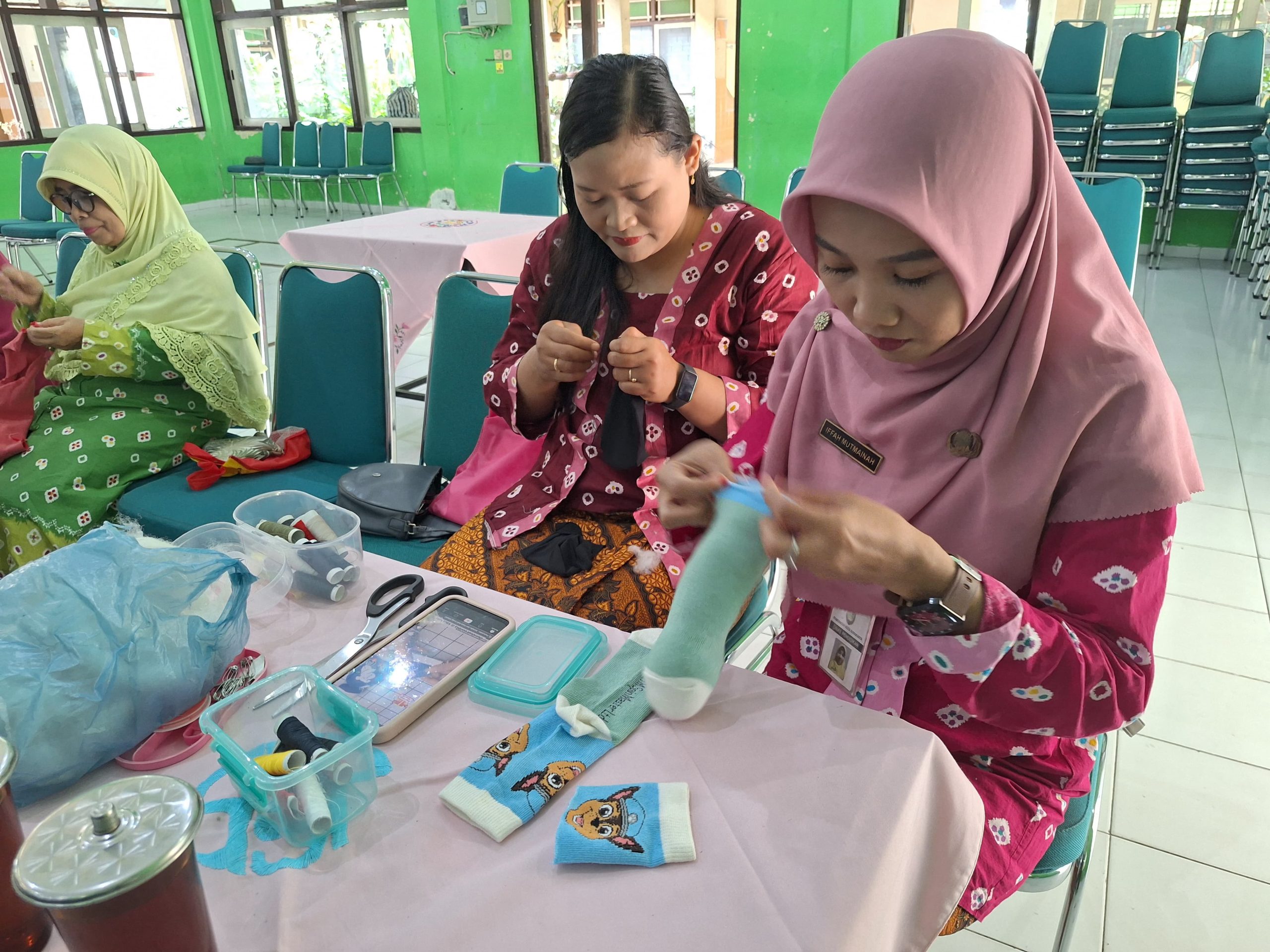 Pada pertemuan tersebut, para anggota belajar untuk membuat boneka dengan memanfaatkan kaos kaki bekas dengan pemateri Siti Latifah, S.Pd., M.Pd. Untuk dapat membuat sebuah boneka, yang diperlukan adalah satu kaus kaki bekas, benang, jarum, gunting, dakron dan kancing. Kedua ujung kaus kaki dipotong secara vertikal kemudian dijahit dibagian dalam untuk membentuk kaki dan telinga. Kaus kaki tersebut kemudian diisi dakron agar padat dan dijahit dengan rapi. Agar tampak semakin nyata, di bagian tengah ditambahkan kancing sebagai mata. Para anggota Dharma Wanita tampak serius dan berusaha membuat boneka-boneka tersebut semenarik mungkin. Beberapa ada yang membuat garis kecil sebagai mulut dan ada pula yang merangkai manik-manik untuk dijadikan kalung.