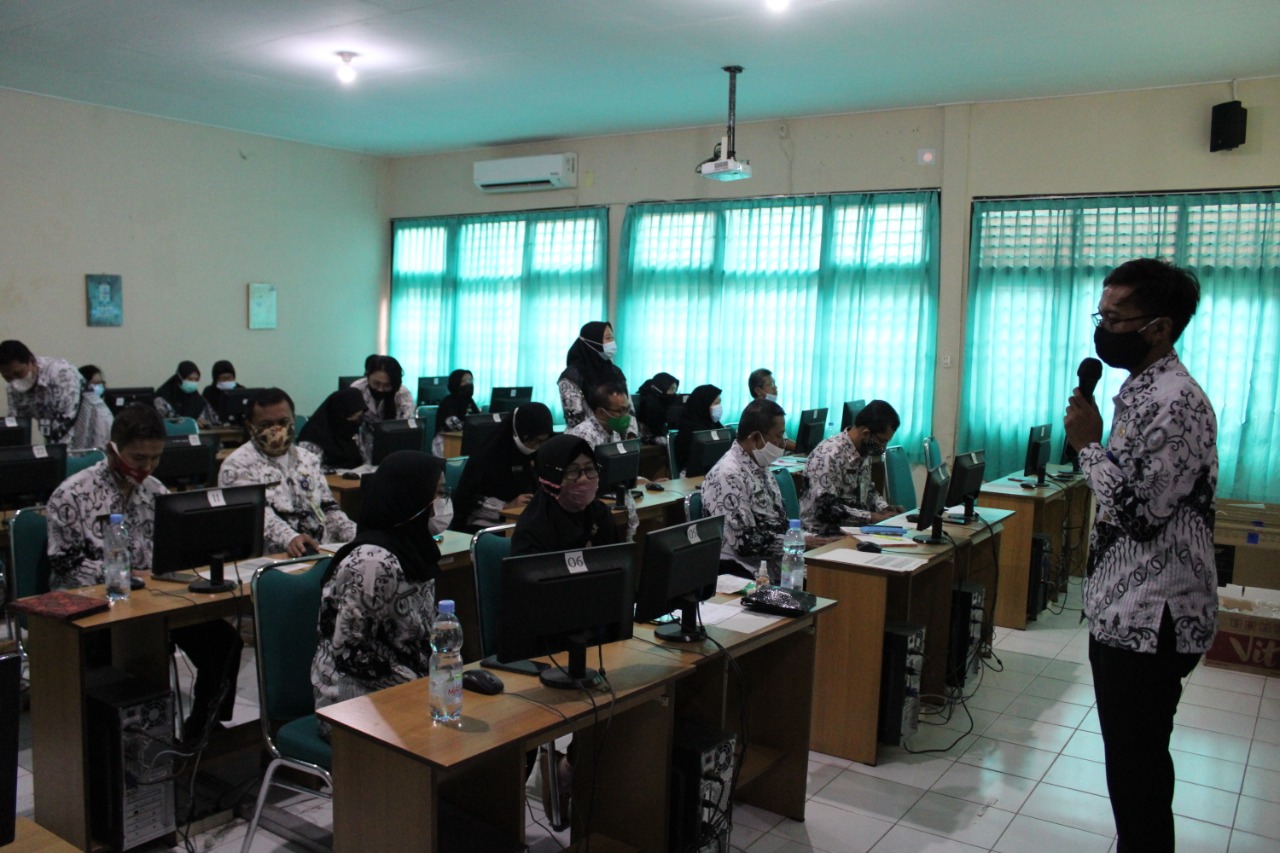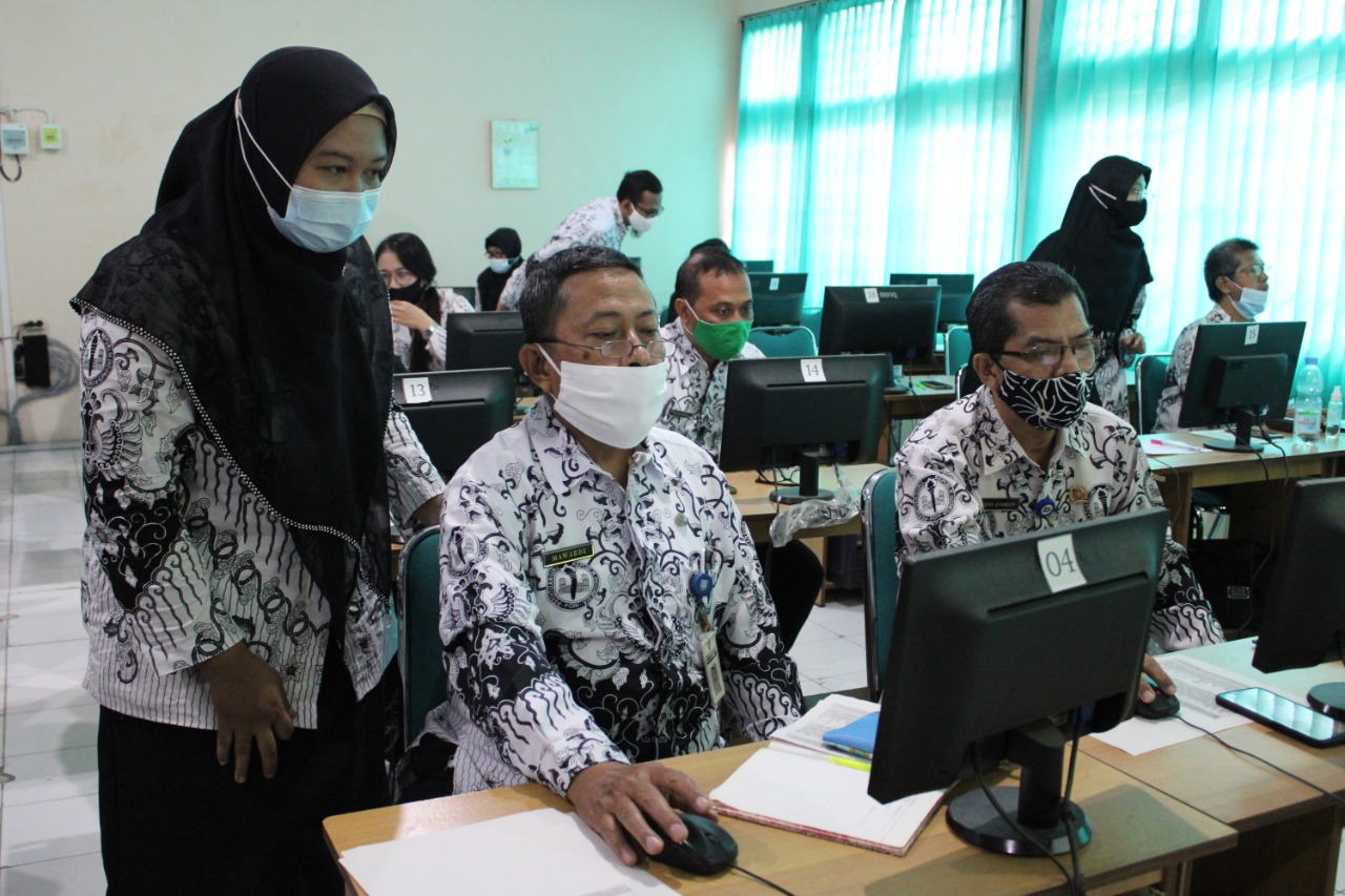 Para guru SMP Negeri 9 Surakarta mengikuti pelatihan penggunaan Google Classroom sebagai media pembelajaran daring, Rabu-Kamis (24-25/2/2021) di Laboratorium Komputer. Pelatihan ini dibagi menjadi dua kloter untuk mengurangi kerumunan dan dilaksanakan dengan tetap mematuhi protokol kesehatan.