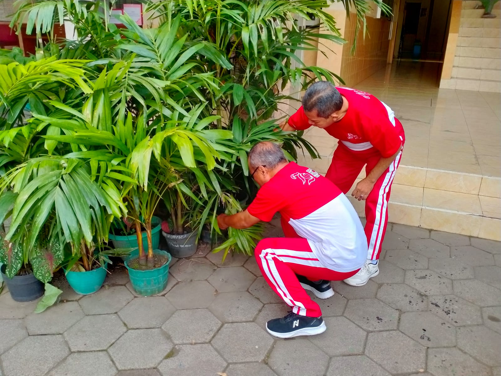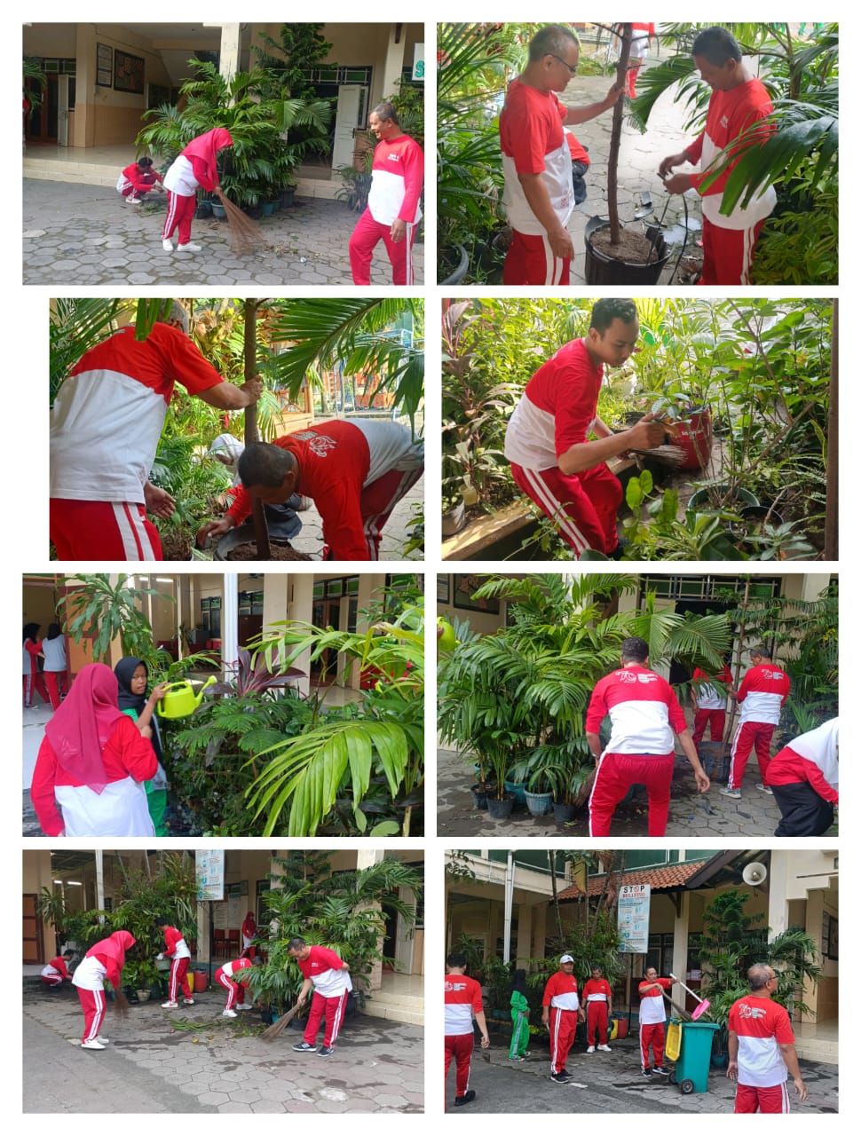 Momen ini juga dimanfaatkan warga sekolah untuk melakukan pemeliharaan tanaman dengan cara memotong dan mengambil daun-daun kering, mengambil sampah yang terselip di sela-sela pot tanaman, menyiram tanaman dan mengganti tanaman yang sudah mati dengan tanaman baru.