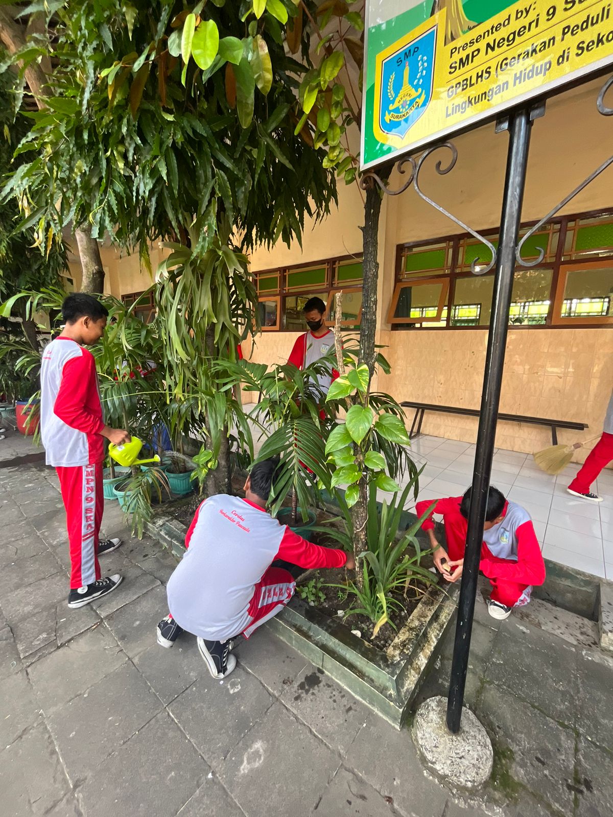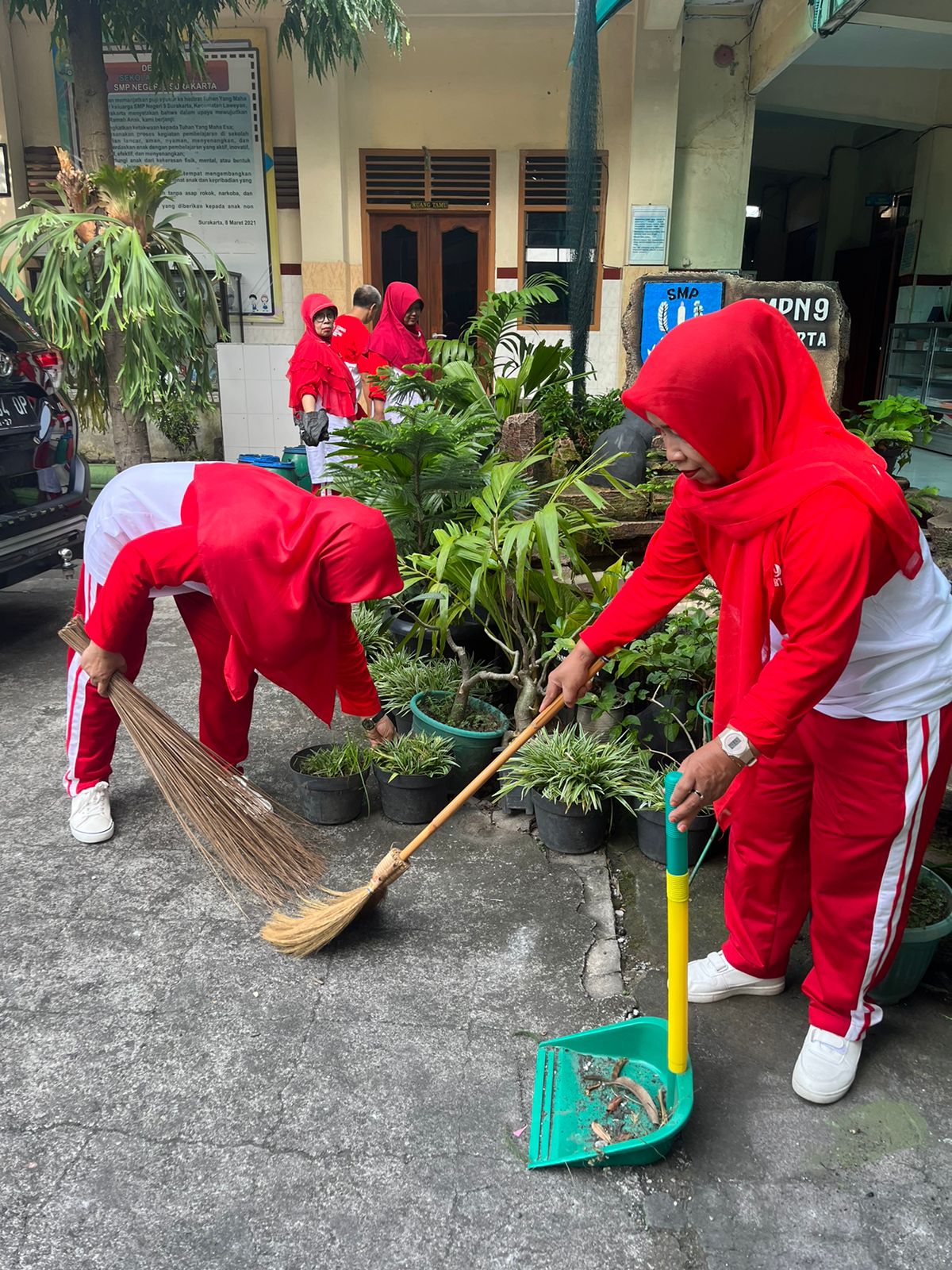 SMP Negeri 9 Kota Surakarta mengadakan kegiatan Jumat bersih pada Jumat (21/2/2025) yang diikuti oleh seluruh warga sekolah. Kegiatan membersihkan lingkungan sekolah ini diadakan sekaligus untuk memperingati Hari Peduli Sampah Nasional (HPSN) 2025. Peserta didik dari setiap kelas bertugas membersihkan kelas dan area depan kelas masing-masing. Sedangkan Tim Adiwiyata membersamai para guru dan tenaga kependidikan berbagi tugas untuk membersihkan area halaman sekolah.