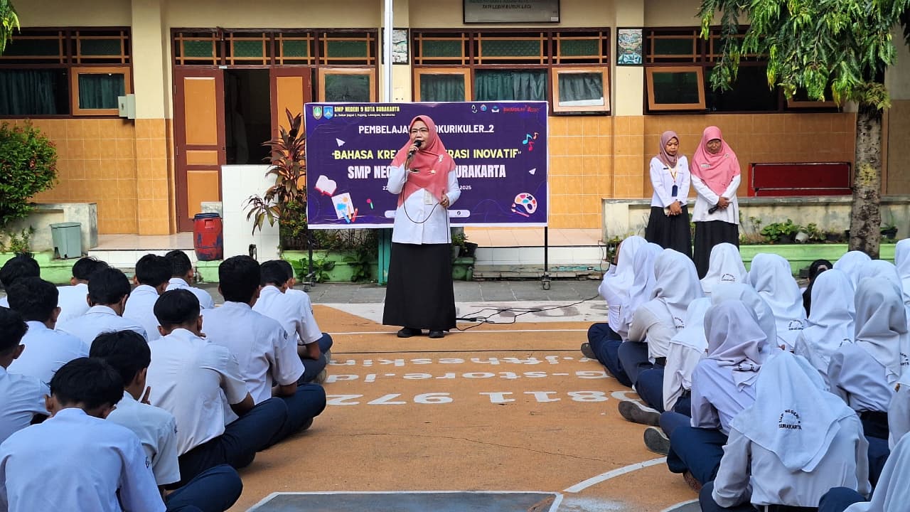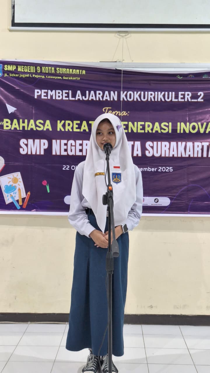 SMP Negeri 9 Kota Surakarta menggelar Semarak Lomba Bulan Bahasa sebagai kegiatan kokurikuler lintas ilmu yang mengusung tema “Bahasa Kreatif, Generasi Inovatif” pada Rabu, (22/10/2025) yang diikuti oleh seluruh murid kelas VII, VIII dan IX. Kegiatan ini diselenggarakan dalam rangka memperingati Bulan Bahasa yang puncaknya akan diadakan pada Hari Sumpah Pemuda 28 Oktober. Terdapat lima lomba yang dipertandingkan dalam kegiatan ini yaitu lomba menulis puisi, lomba menulis dan membaca Aksara Jawa, lomba pidato Bahasa Inggris, lomba mading-pojok baca-kebersihan dan lomba menyanyikan lagu nasional. Seluruh murid mendapatkan kesempatan untuk mengikuti lomba-lomba yang diadakan dengan sistem bagi tugas untuk memastikan semuanya dapat berpartisipasi.