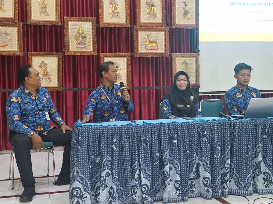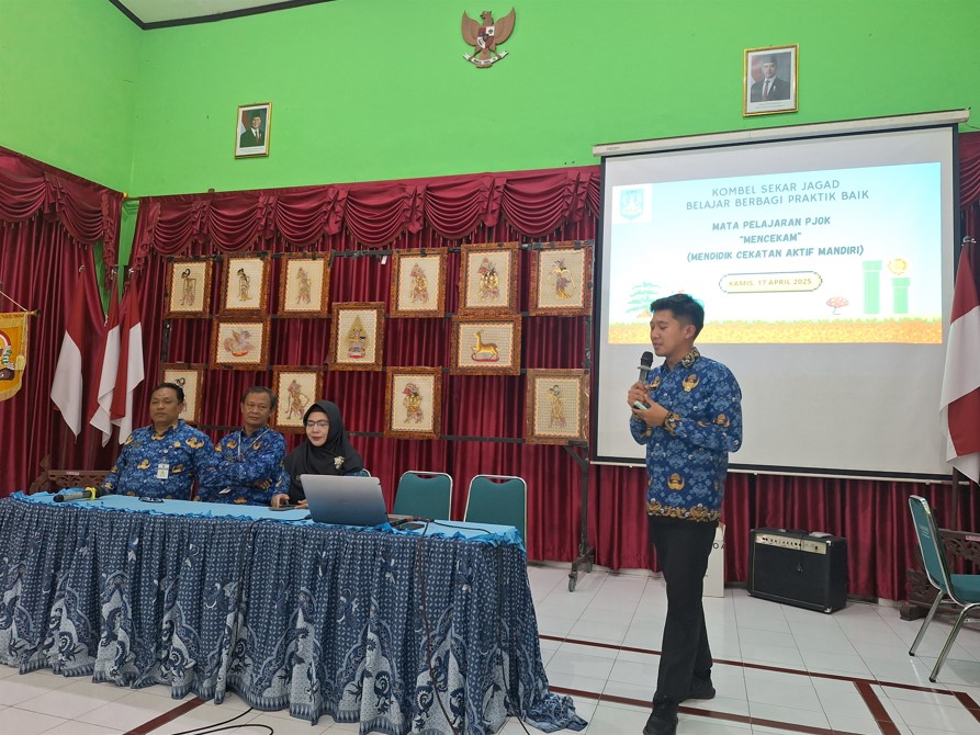 Guru PJOK, Bukhori Romadhon, S.Pd. menyampaikan praktik baik MENCEKAM (Mendidik Cekatan Aktif Mandiri) dalam Kombel SekarJagad Belajar SMP Negeri 9 Kota Surakarta, Kamis (17/4/2025)