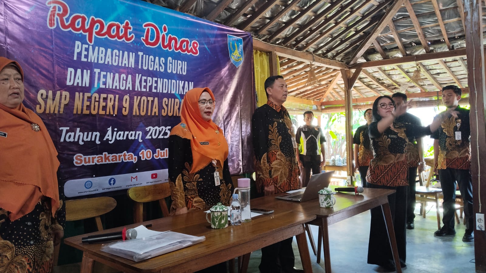 Semangat menyongsong tahun ajaran baru seluruh guru dan tenaga kependidikan (GTK) SMP Negeri 9 Kota Surakarta melaksanakan rapat dinas yang dilaksanakan pada Kamis, 10 Juli 2025. Kegiatan ini dilaksanakan di luar sekolah dengan nuansa yang berbeda dengan tujuan menambah imun postif. Susunan acara kegiatan rapat dinas yaitu pembukaan dengan berdoa, menyanyikan lagu Indonesia Raya, sambutan dan motivasi kepala SMP Negeri 9 Kota Surakarta, acara inti pembagian tugas, dan penutup.