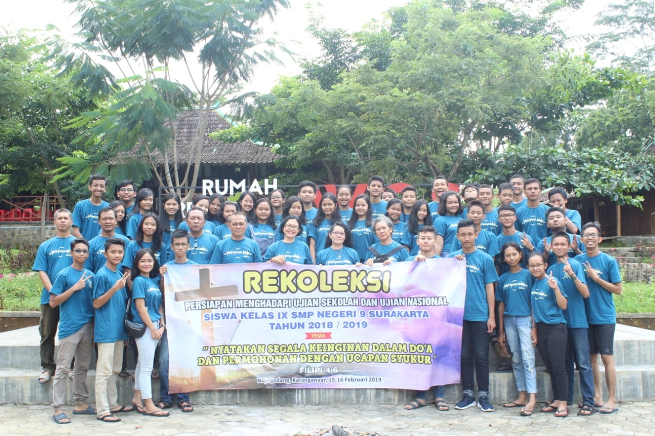 Siswa-siswi Rohani Kristen (Rokris) dan Katolik (Rokat) kelas IX SMP N 9 Surakarta mengadakan Rekoleksi Persiapan Menghadapi Ujian Nasional tahun ajaran 2018/2019 dengan tema “Menyatakan Segala Keinginan Dalam Doa dan Permohonan dengan Syukur” di “Rumah Revolusi Mental” Mojo Gedang Karanganyar pada 15 s.d. 16 Februari 2019. Kegiatan ini diikuti oleh seluruh siswa-siswi Rohani Kristen dan Katolik kelas IX, beserta alumni Rokris dan Rokat SMP N 9 Surakarta. Kegiatan ini digelar setiap tahun dalam rangka memberi semangat dan dukungan serta motivasi bagi siswa-siswi kelas IX SMP N 9 Surakarta yang akan melaksanakan Ujian Nasional Berbasis Komputer (UNBK). Kegiatan ini juga bertujuan untuk mendekatkan diri pada Tuhan Yang Maha Esa agar diberi penyertaan dan bimbingan dalam menghadapi UNBK.