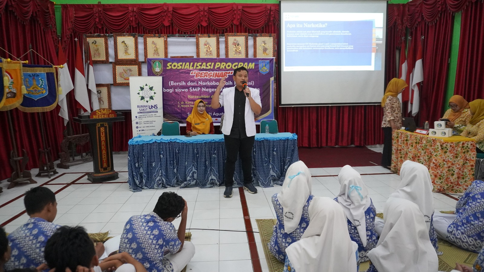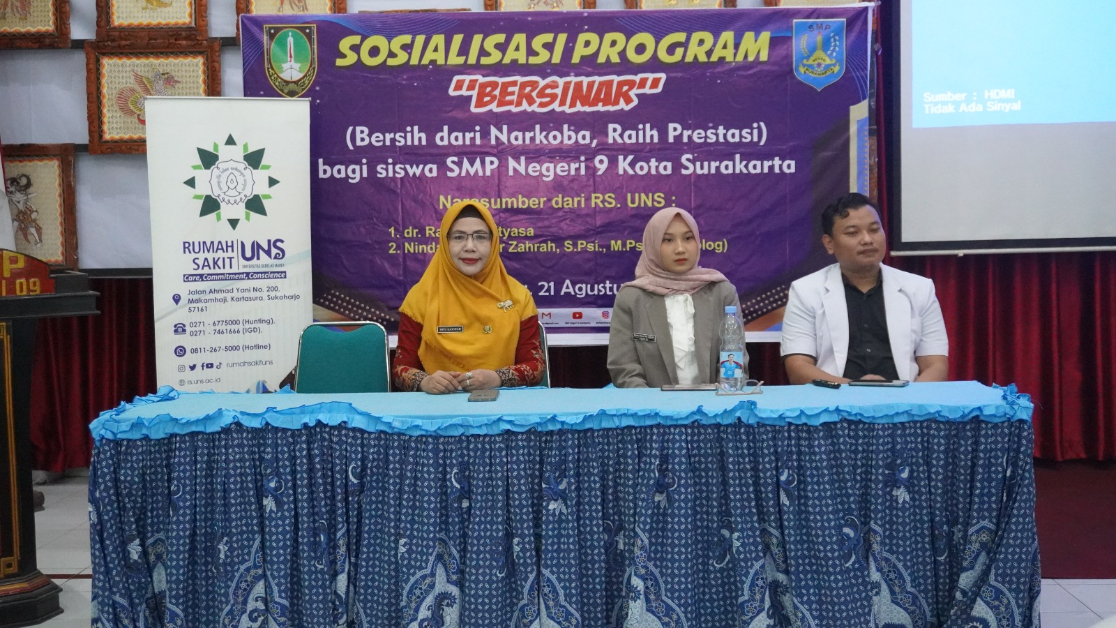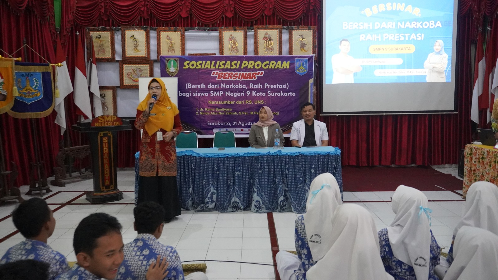 Kamis, (21/8/2025) bertempat di aula SMPN 9 Kota Surakarta, kurang lebih 280 murid kelas 9 mengikuti program Bersinar (Bebas Narkoba Raih Prestasi). Selain murid, guru pengajar kelas 9 beserta staf tata usaha turut mendampingi kegiatan ini. Kegiatan yang merupakan hasil kolaborasi dengan Rumah Sakit Universitas Negeri Sebelas Maret (RS UNS) ini bertujuan untuk memberikan pemahaman mendalam tentang bahaya narkoba dan pentingnya hidup sehat tanpa rokok. Kegiatan ini dihadiri oleh dua narasumber yakni dr. Rama Sanityasa dan Ninda Alza Nur Zahrah, S.Psi., M.Psi.