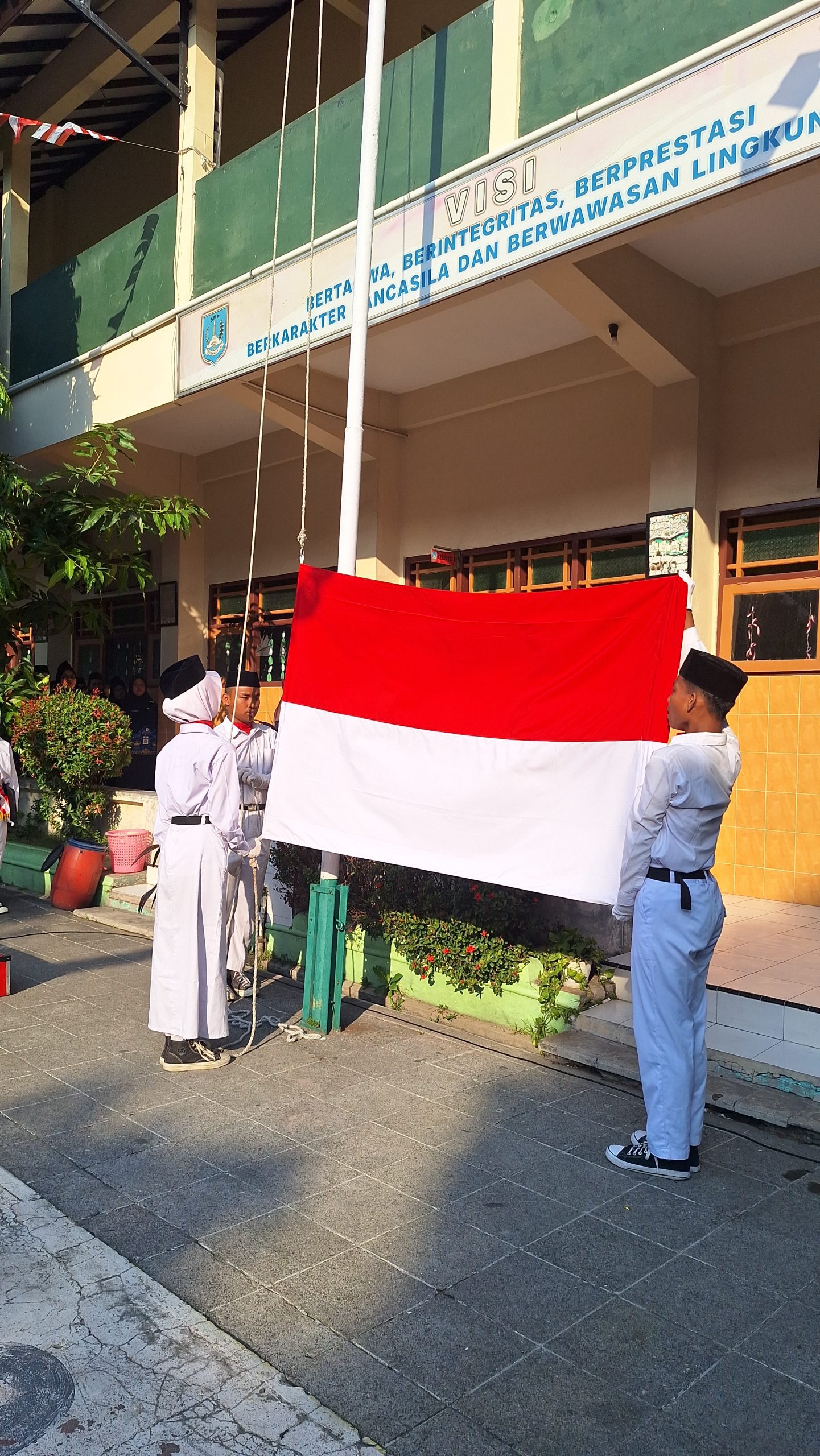 Petugas pembawa bendera adalah Edgina (IX I), pembentang bendera adalah Samgar Seraf L. M (VIII C) dan pengerek bendera yaitu Samuel Daru Yunanto (IX B) saat proses pengibaran bendera.