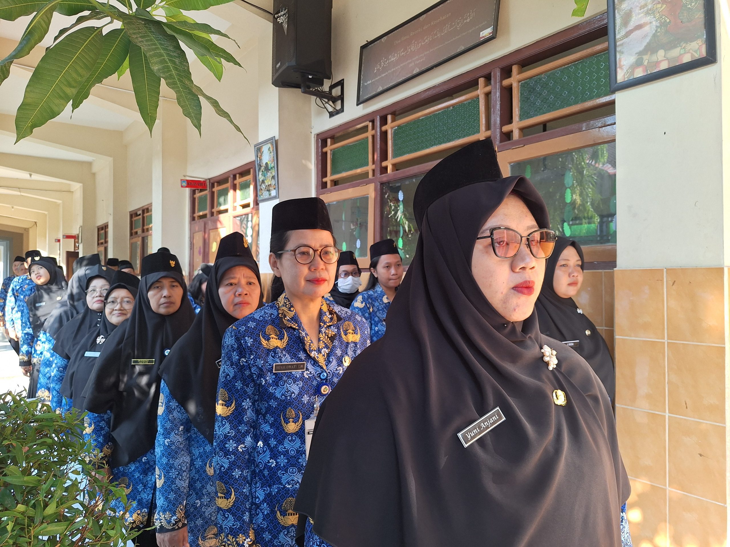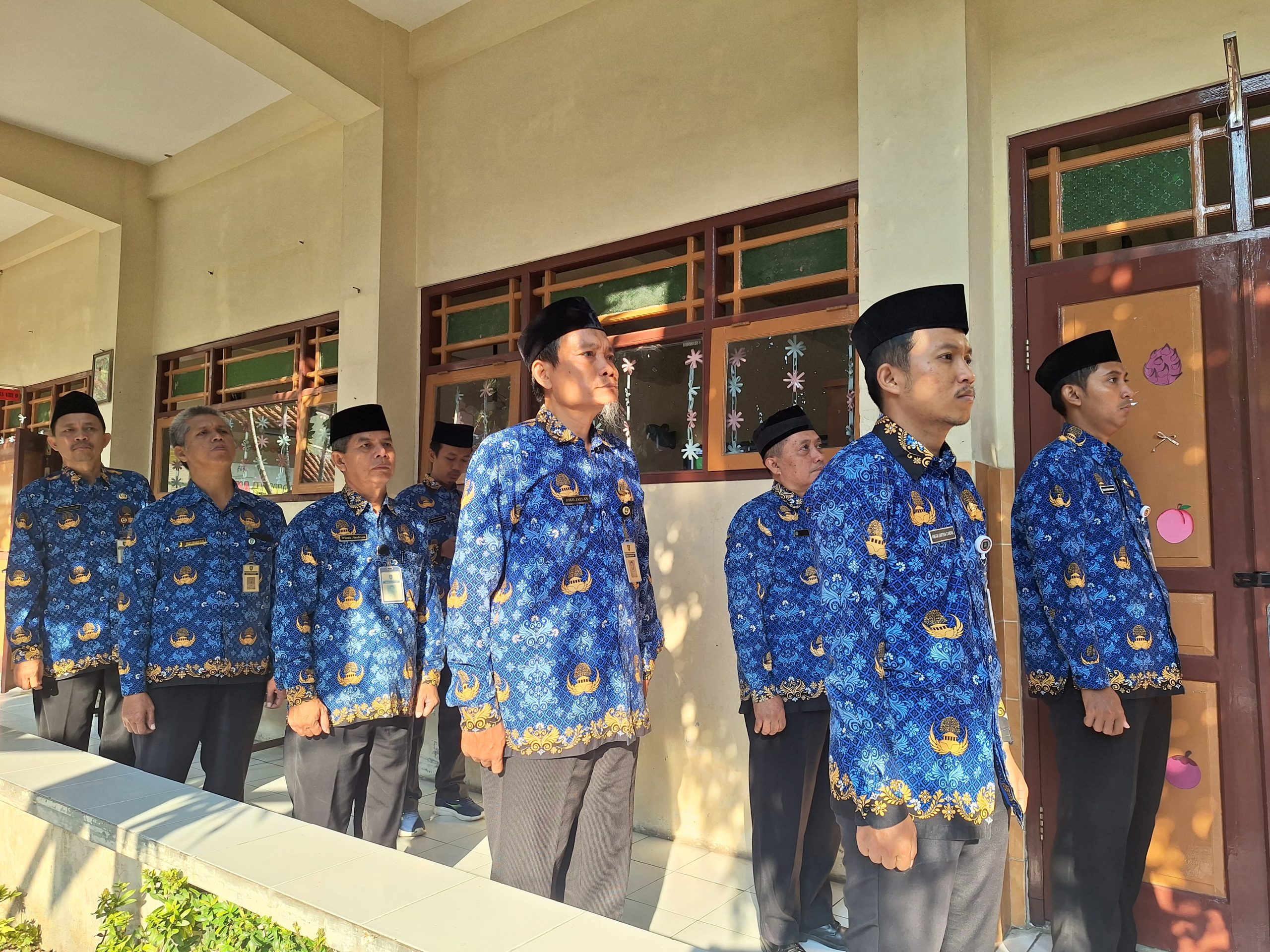 Para guru dan tenaga kependidikan mengikuti upacara bendera peringatan HUT RI ke-80 di SMP Negeri 9 Kota Surakarta.